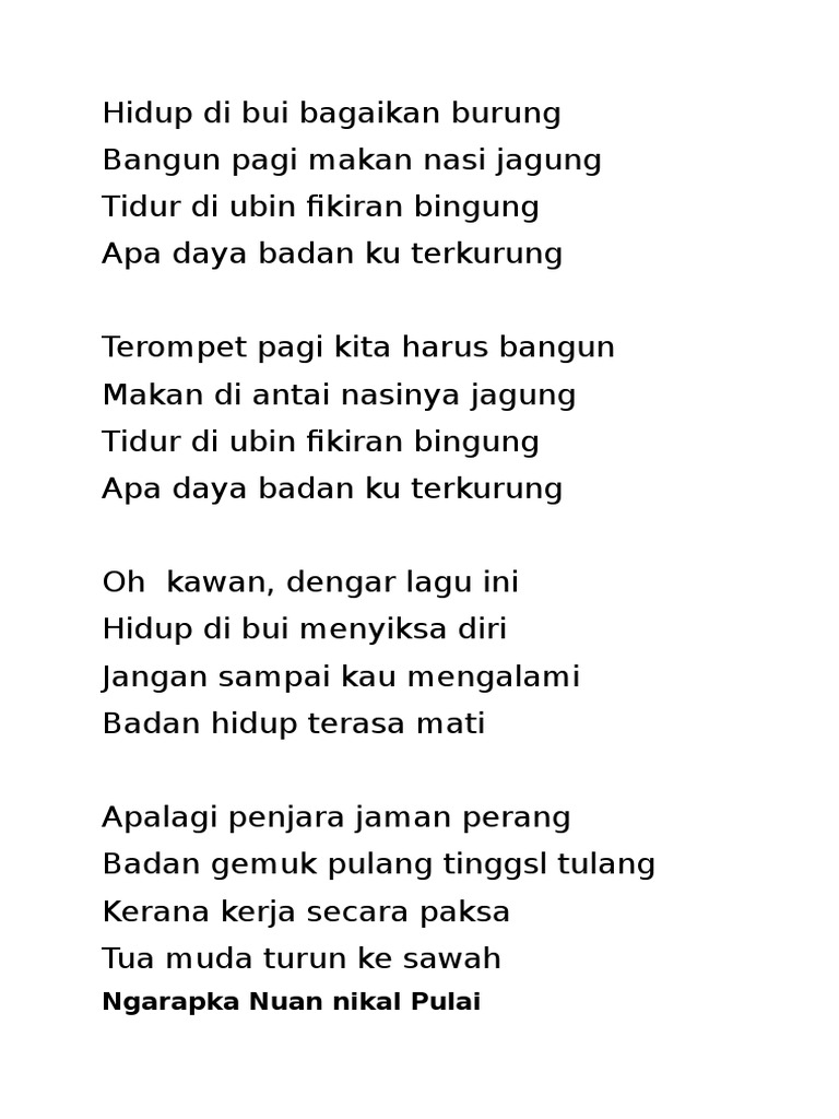 Intro D G A D Verse D G Hidup di bui bagaikan burung A D Bangun pagi makan nasi jagung D A Tidur di ubin pikiran bingung A D Apa daya badan ku terkurung D G Terompet pagi kita harus bangun A D Makan di antri nasinya jagung D A Tidur di ubin Pikiran bingung A D. Bila tidak berhasil coba untuk mengilangkan tanda kutip misal. Hidup di bui bagaikan burung Bangun pagi makan nasi jagung Tidur di ubin pikiran bingung.